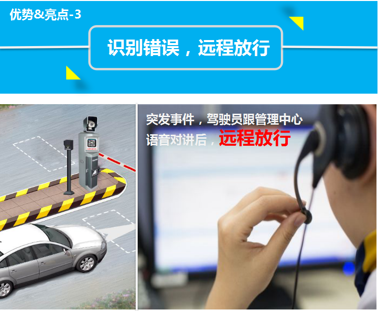 无人值守,无牌车扫描进场、扫描缴费出场;若出入口不能识别出场,则直接与管理中心对讲,远程记录开闸。